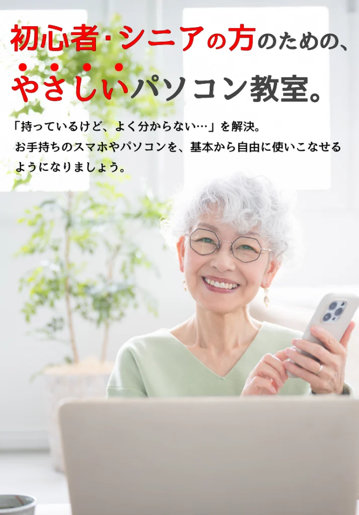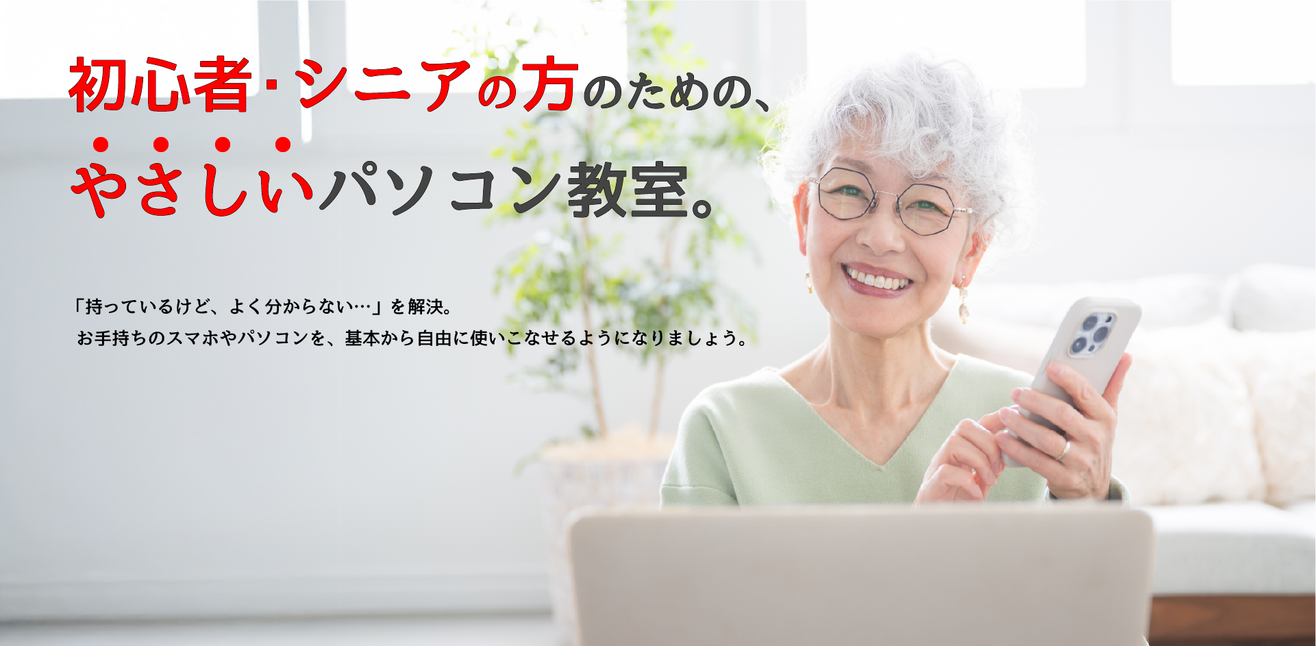 当教室では、電源の入れ方、文字の打ち方といった「基本のキ」から、講師があなたのすぐ隣で「ゆっくり、優しく、何度でも」丁寧にお教えします。