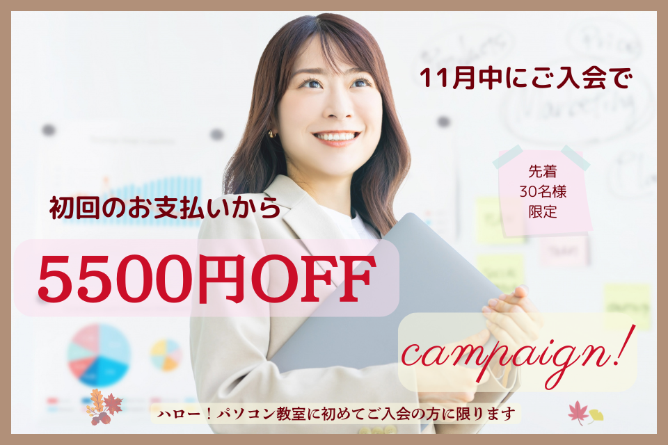 *本キャンペーンの適用は、ハロー!パソコン教室に新規にご入会いただく生徒様に限らせていただきます。