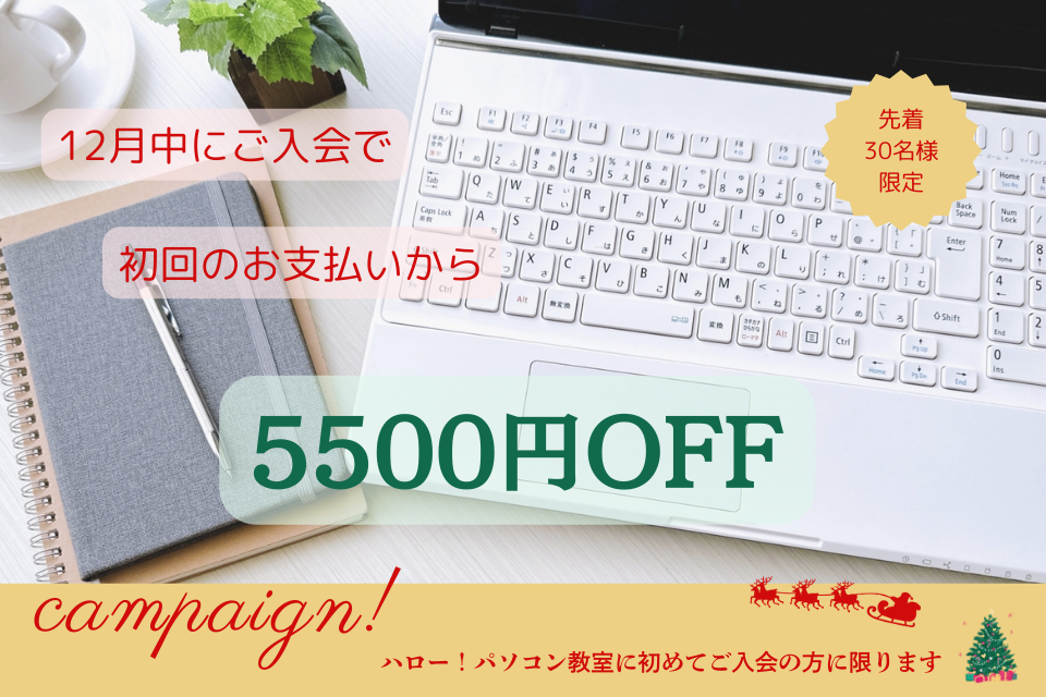 *本キャンペーンの適用は、ハロー!パソコン教室に新規にご入会いただく生徒様に限らせていただきます。
