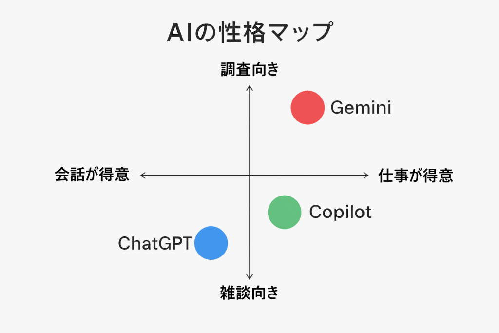 同じAIでも、向いている役割がまったく違うことが分かります。